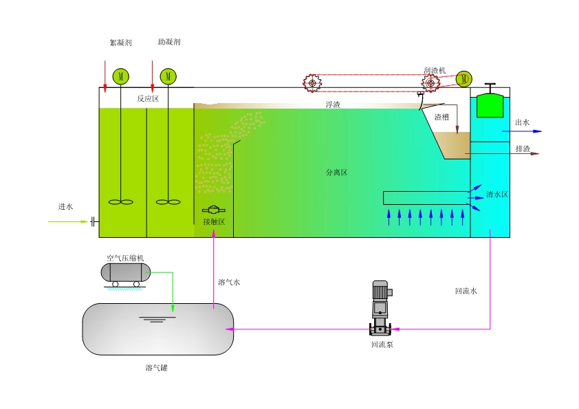 回流清水經過射流吸氣裝置,在一定的工作壓力下,使空氣更大限度地溶入水中,成為溶氣水,溶氣水在氣浮池的接觸區內,通過釋放裝置的快速減壓釋放,形成直徑在5-10μm的微氣泡。該微氣泡即可與原水中絮體相互粘合。